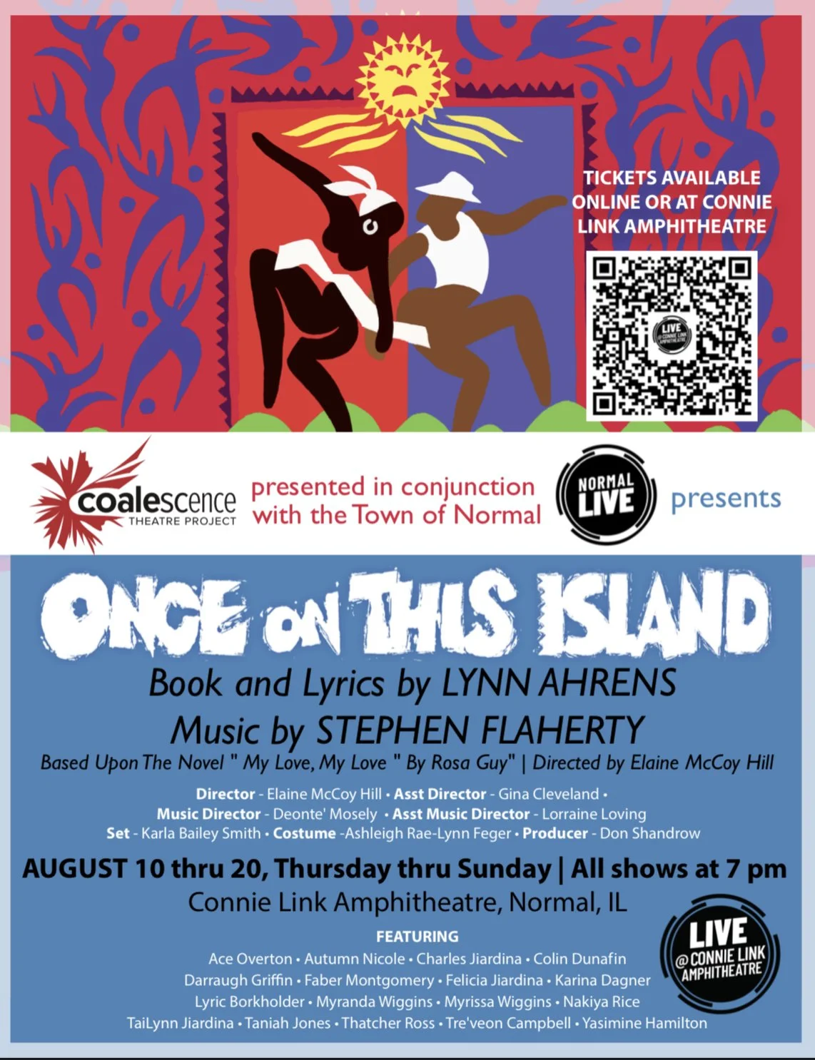 Get ready to be swept away on an extraordinary journey as Coalescence Theatre Project, in conjunction with Normal Live, present the highly anticipated musical, "Once on This Island," at the Connie Link Amphitheatre. The vibrant and magical production will take audiences on a spellbinding adventure, filled with love, hope, and the power of storytelling.